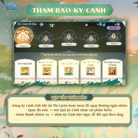 - Thao tác: Mỗi lần Thám Bảo sẽ tiêu hao 1 Kỳ Cảnh Linh Khí và mang lại một phần thưởng ngẫu nhiên.