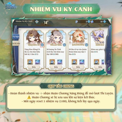 - Nhiệm vụ Quà Kỳ Cảnh: Có tổng cộng 5 vòng nhiệm vụ. Hoàn thành tất cả các nhiệm vụ con trong mỗi vòng sẽ nhận được thêm phần thưởng lớn.