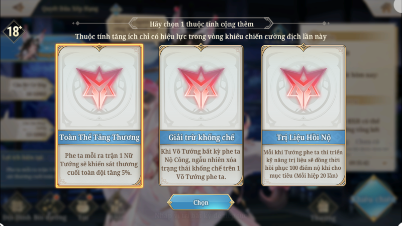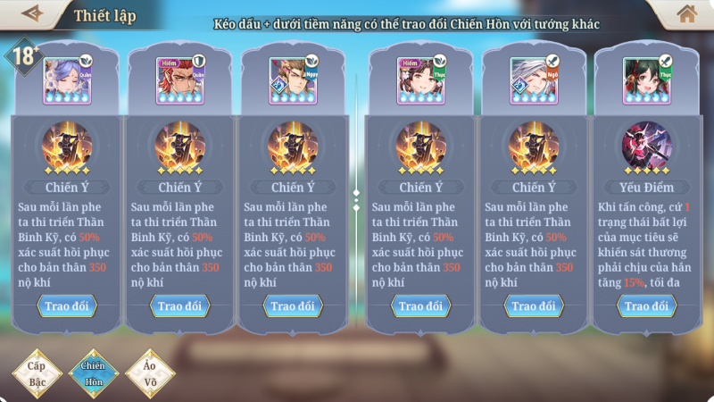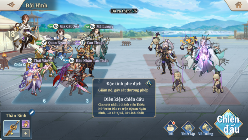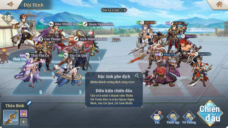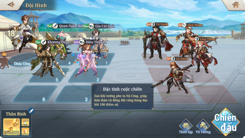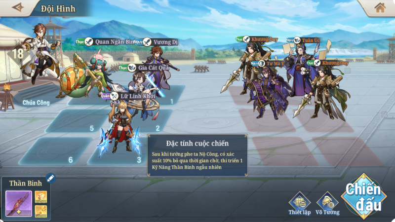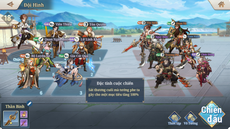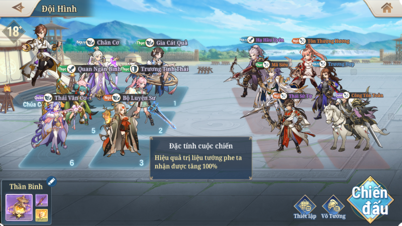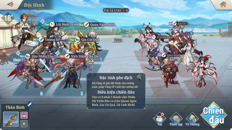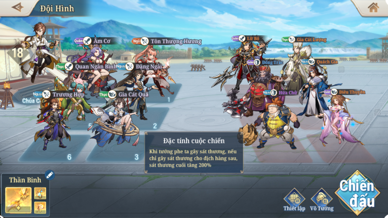 • Trong chiến đấu, tất cả thuộc tính Võ Tướng của người chơi sẽ được chỉnh sửa thành cấp thống nhất, trong đó Võ Tướng, Ảo Võ có thể nhận và bồi dưỡng thông qua [Lưu Diễn Nhóm], Thần Binh sẽ kế thừa bồi dưỡng cá nhân của Chúa Công. Ngoài ra, khi bày trận cần ra trận tối thiểu 1 thành viên Đội Nữ Đào Viên.