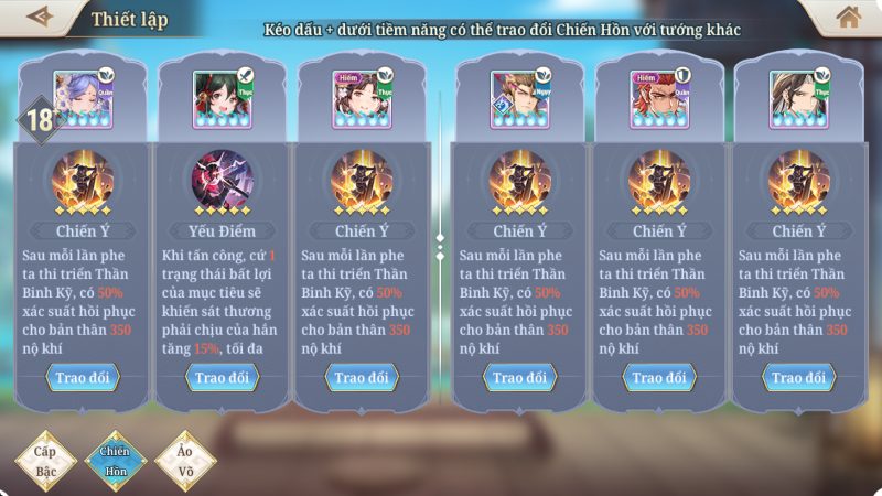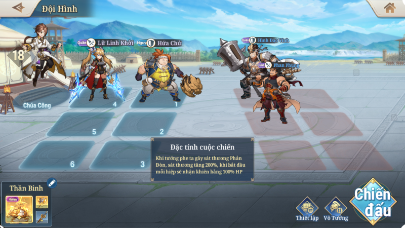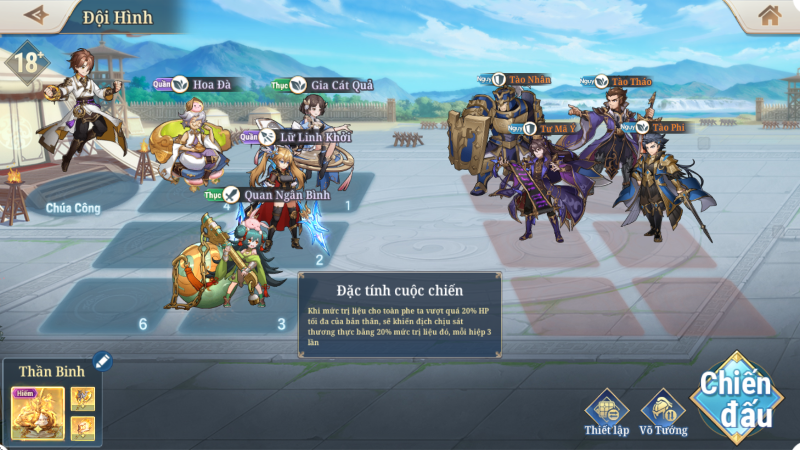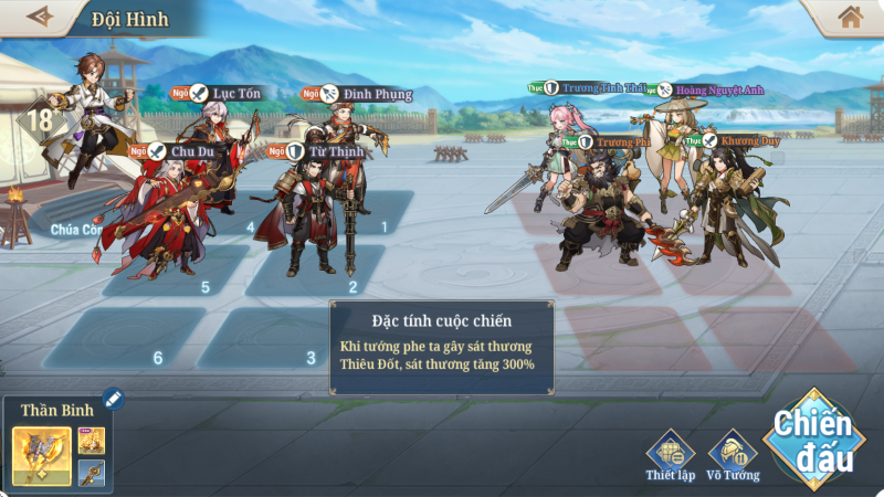 Trong quá trình lưu diễn, mỗi ải sẽ cung cấp Võ Tướng riêng, cần điều chỉnh đội hình để vượt ải.