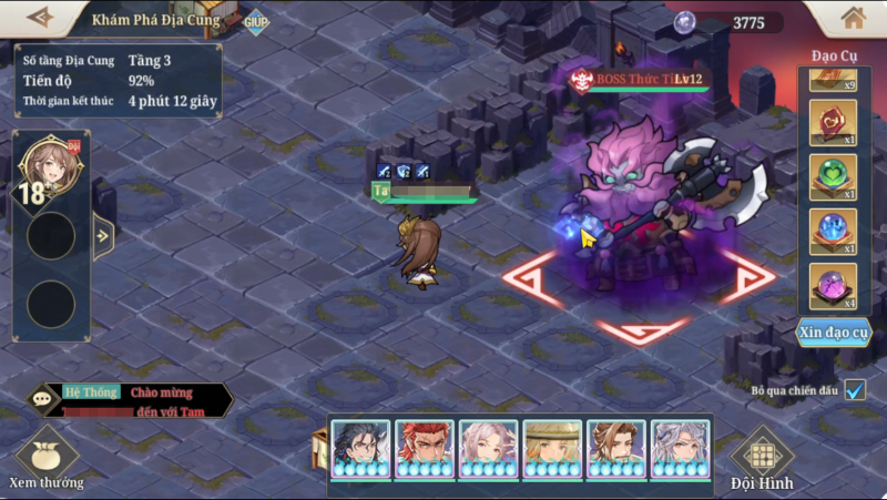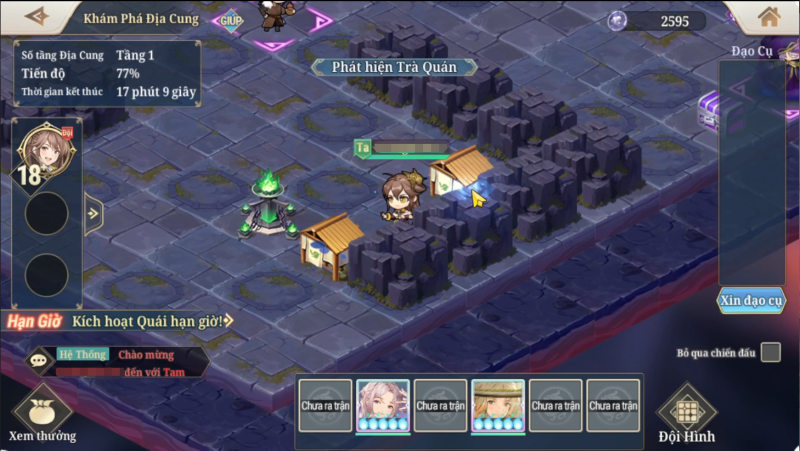• 1 người lực chiến cao nhất: nhặt rương, mua tướng, thần binh để khiêu chiến quái, Boss. Không tham gia đập khoáng vì có thể trúng bẫy giảm HP đội hình.